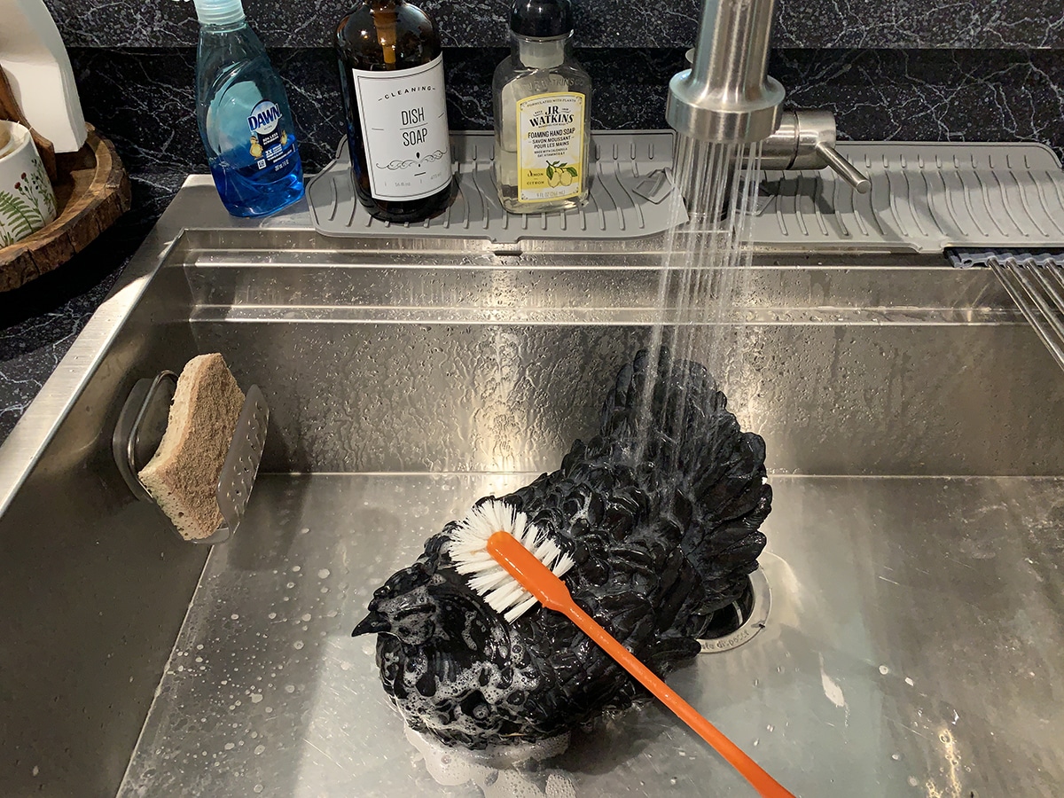 I would have just put it out "as is." But it looks so much better as a faux concrete chicken!
