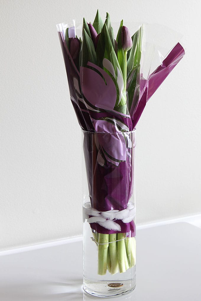 After the fresh cut, immediately place the tulips in a tall narrow vase filled with ice water. You want a vase that will hug your tulips tightly and not let them flop around right now.