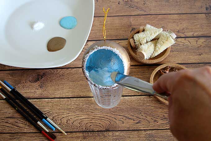 Spread a little bit of the faux dimensional snow on the bottom of the inside of the ornament (you maybe don't want to use your good silverware though, a popsicle stick would be a better choice).