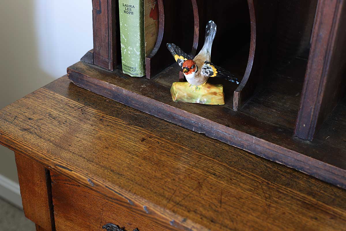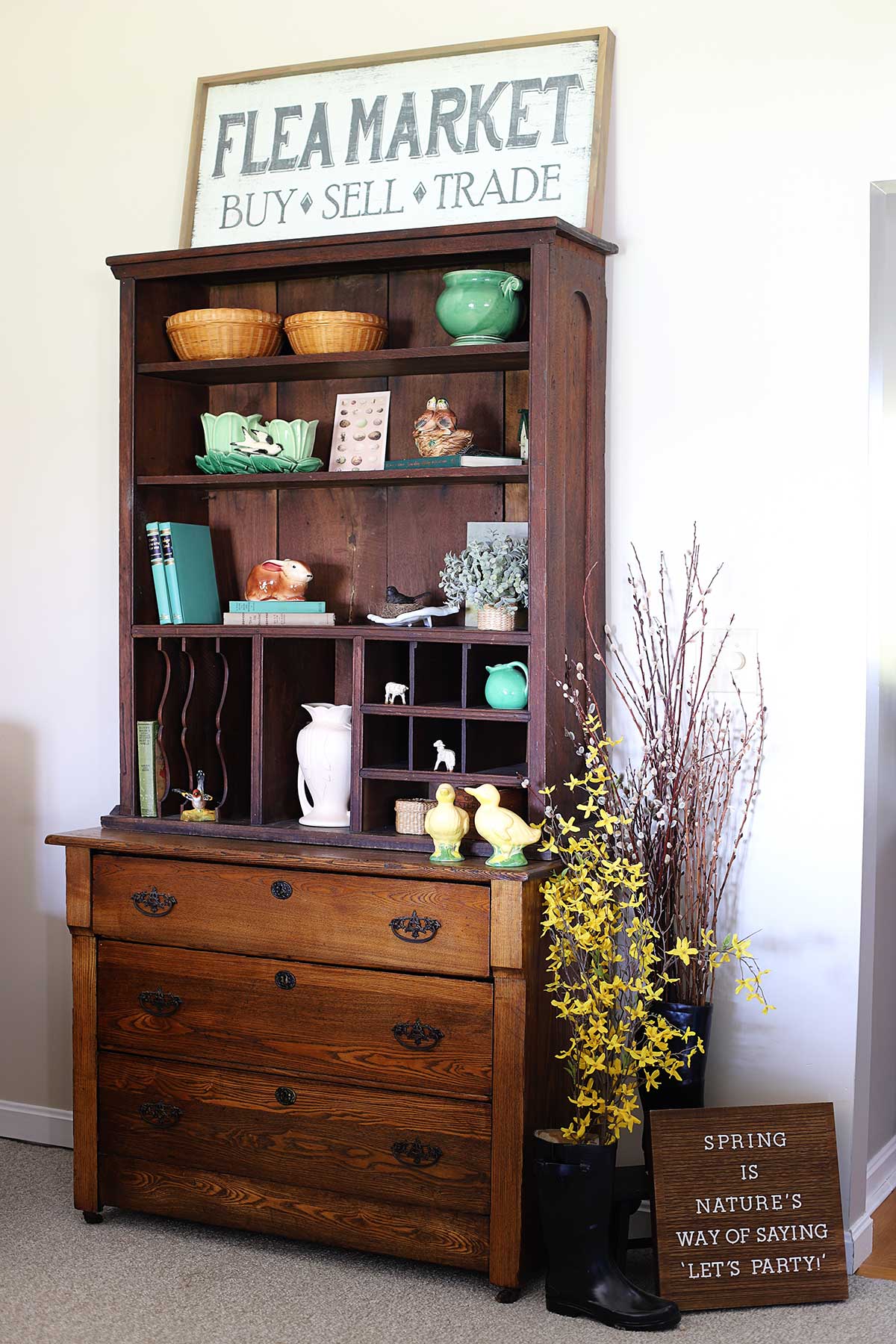 Not only is it a beautiful old dresser but that shelf knocks it out of the park! I mean, yeah they don’t match but then again they do. I’d “dye” for something like that! Wonder how the guy got in your vehicle by himself? I too have a hutch top that is so heavy it literally takes 6 of us to move it. You couldn’t have found a more authentic looking piece and it looks so nice where it is!