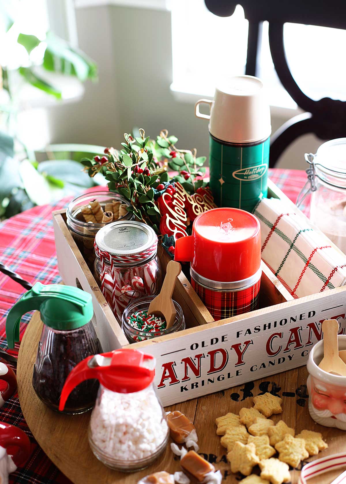 A couple years ago I made a cute hot chocolate station out of a plaid school lunchbox. It was compact, just the right size for 2 people and it looked very festive setting on the counter.