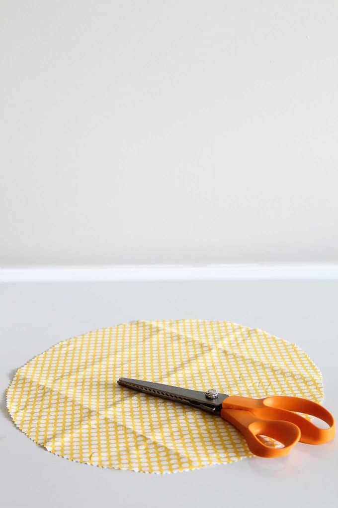 Cut out your fabric in the desired shape. I used a large plate as a template for my bowl covers and a tape measure for cutting out the sandwich covers (12x12).