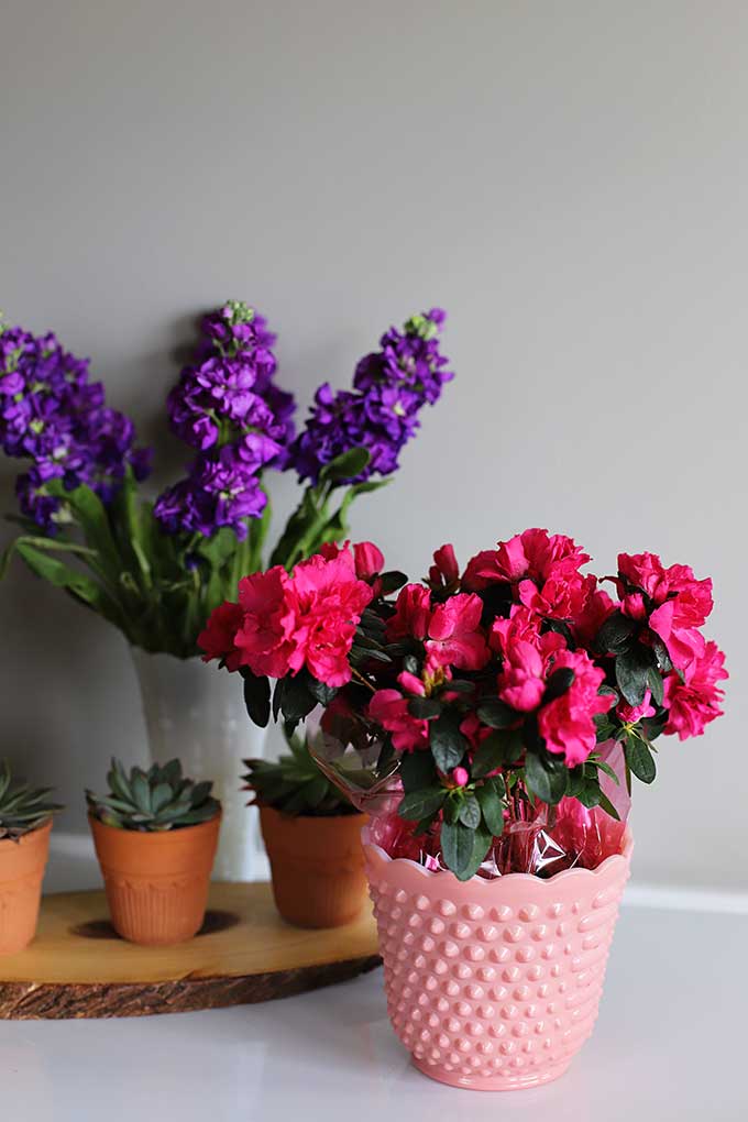 The one on the right is an azalea and the Heavenly purple cut flowers in the back are called stock.
