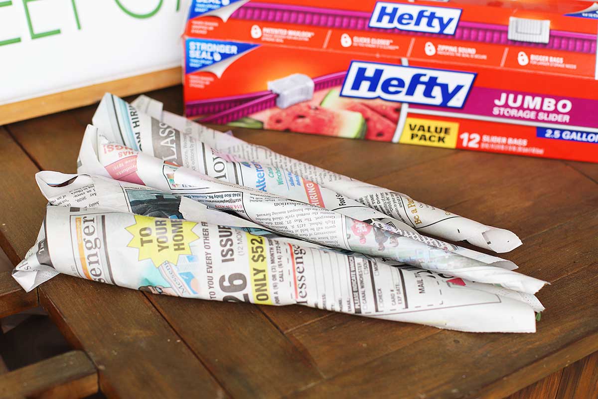 Cover the entire stem, bud and all, and tape the newspaper ends down. - Put Wrapped Stems In Plastic Bag