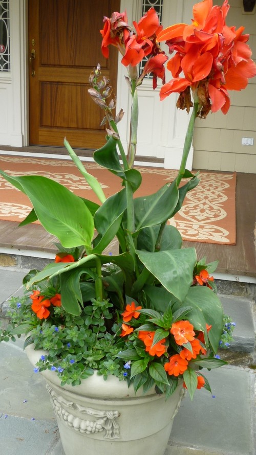 The wonderful orange colored canna adds height and matches the new guinea impatiens below.