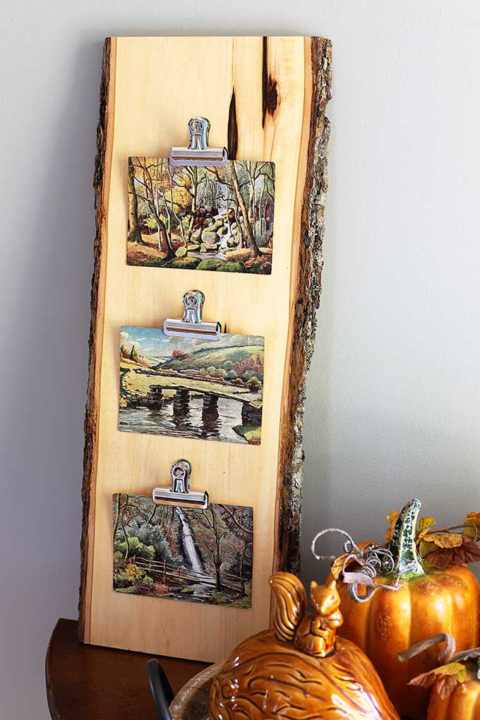 NOTE: You can easily make this a wall mounted postcard display by attaching a simple picture hanger to the back of the wood (one of those sawtooth ones or the stick-on velcro Command ones).