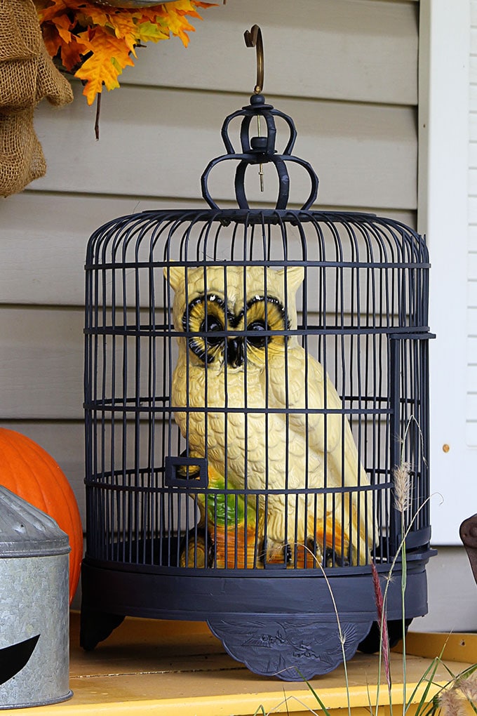 I haven't done a tutorial on the owl yet, because it's basically an owl I found at the thrift store and put inside a birdcage that I had painted dark grey.