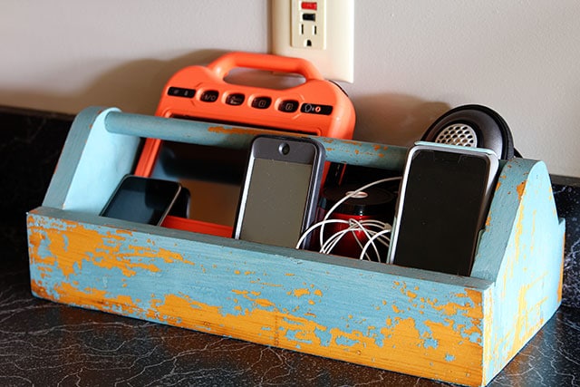 This is my cellphone charger area. It's my attempt to corral the sea of cords and technology! And it's just a thrift store toolbox painted with Miss Mustard Seed's milk paint in Kitchen Scale.