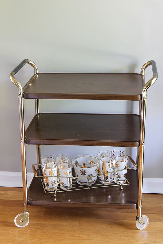 I was thinking she would make a great bar cart, but after I pulled out my vintage Libby Golden Foliage bar set I realized