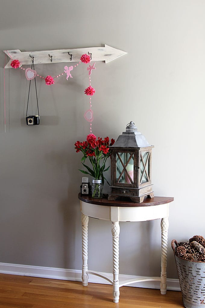 I had originally planned on hanging it on my blue dresser in the living room, but it was too long for that so I ended up throwing it cattywampus onto my coat hook in the hallway. And it wasn't until I was writing this post that it occurred to me that the arrow coat hook sort of went with my Valentine's Day theme.